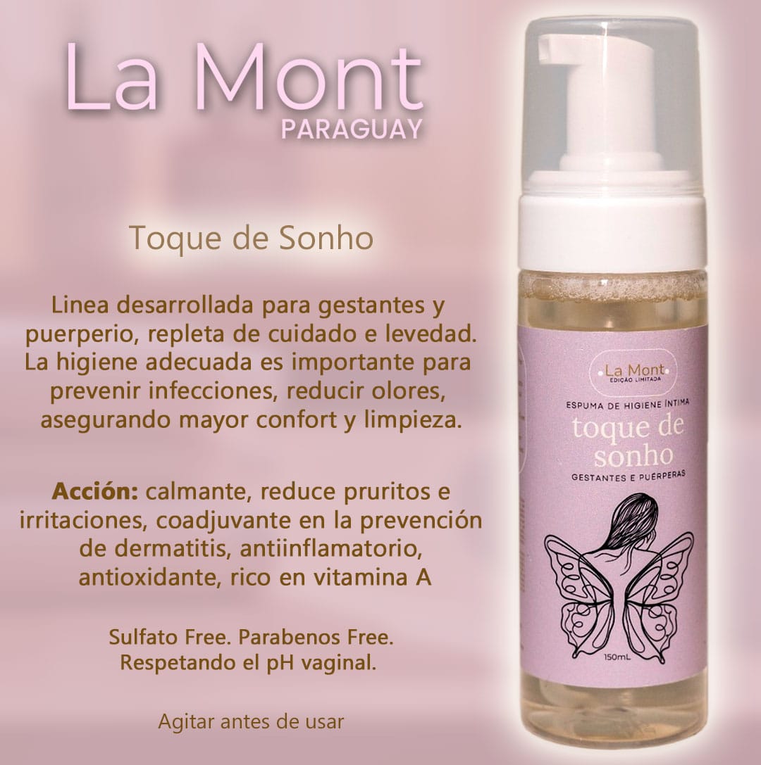 EMBARAZOESPUMAHIGIENE ÍNTIMALA MONTPARA MUJERESPIEL SENSIBLEToque de Sonho es una espuma de higiene íntima especialmente formulada para mujeres embarazadas y en postparto. Su acción calmante y antioxidante ayuda a prevenir infecciones, reducir olores y aliviar irritaciones, proporcionando mayor comodidad y protección.